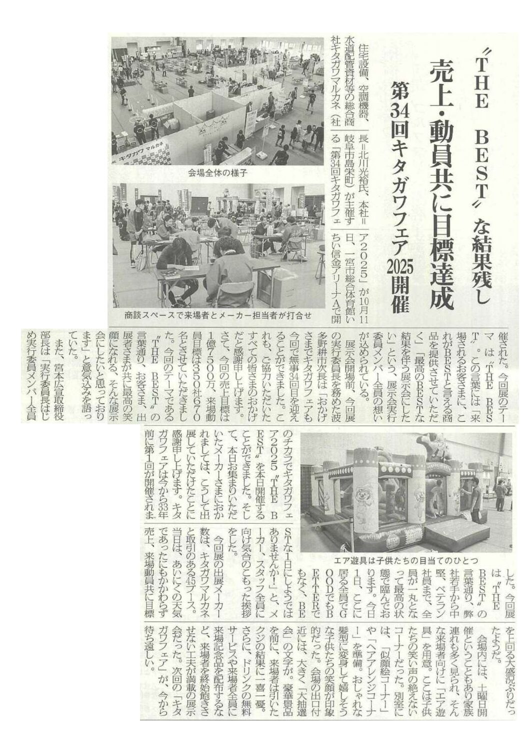 「キタガワフェア2025」新聞掲載のお知らせ 2025 12/08 お知らせ 2025年12月8日 10月に開催されました「キタガワフェア2025」が、12月7日(日)発行の名古屋機工新聞に掲載されました。 当日の様子を、ぜひご覧ください。 お知らせ ☆3ヶ月連続!新キャラクター登場企画スタート☆ ★追い日記★ぶちょ~日記 関連記事 年末・年始休業のお知らせ 2025年11月21日 キタガワフェア2025 開催のお知らせ! 2025年8月21日 アジア大会 結果 2025年5月28日 空手速報 2025年5月23日 ボクシング勝利 2025年4月9日 正社員募集中! 2025年3月1日 臨時休業のお知らせ 2025年1月10日 空手W杯速報 2024年11月25日