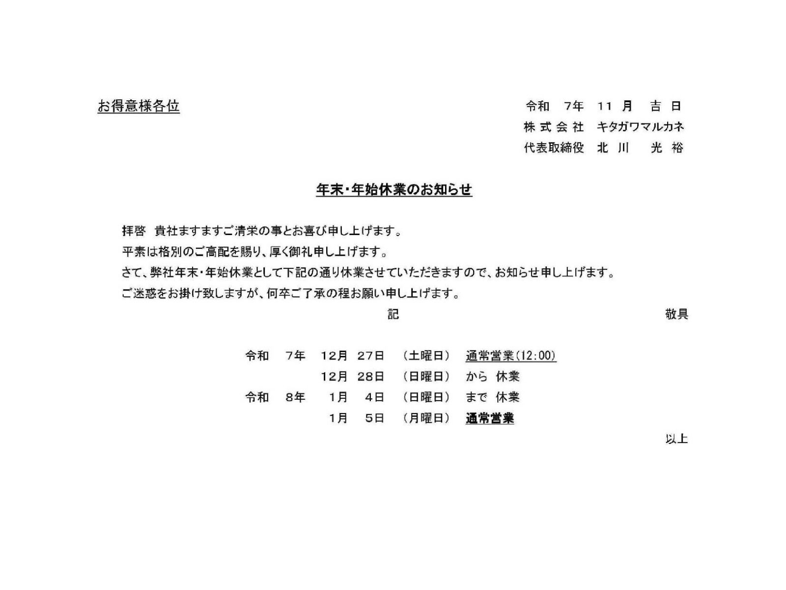 年末・年始休業のお知らせ 2025 11/21 お知らせ 2025年11月21日2026年1月22日 お知らせ 年末年始セール!! ★久しぶりの海★しゃちょ~日記 関連記事 「キタガワフェア2025」新聞掲載のお知らせ 2025年12月8日 キタガワフェア2025 開催のお知らせ! 2025年8月21日 アジア大会 結果 2025年5月28日 空手速報 2025年5月23日 ボクシング勝利 2025年4月9日 正社員募集中! 2025年3月1日 臨時休業のお知らせ 2025年1月10日 空手W杯速報 2024年11月25日